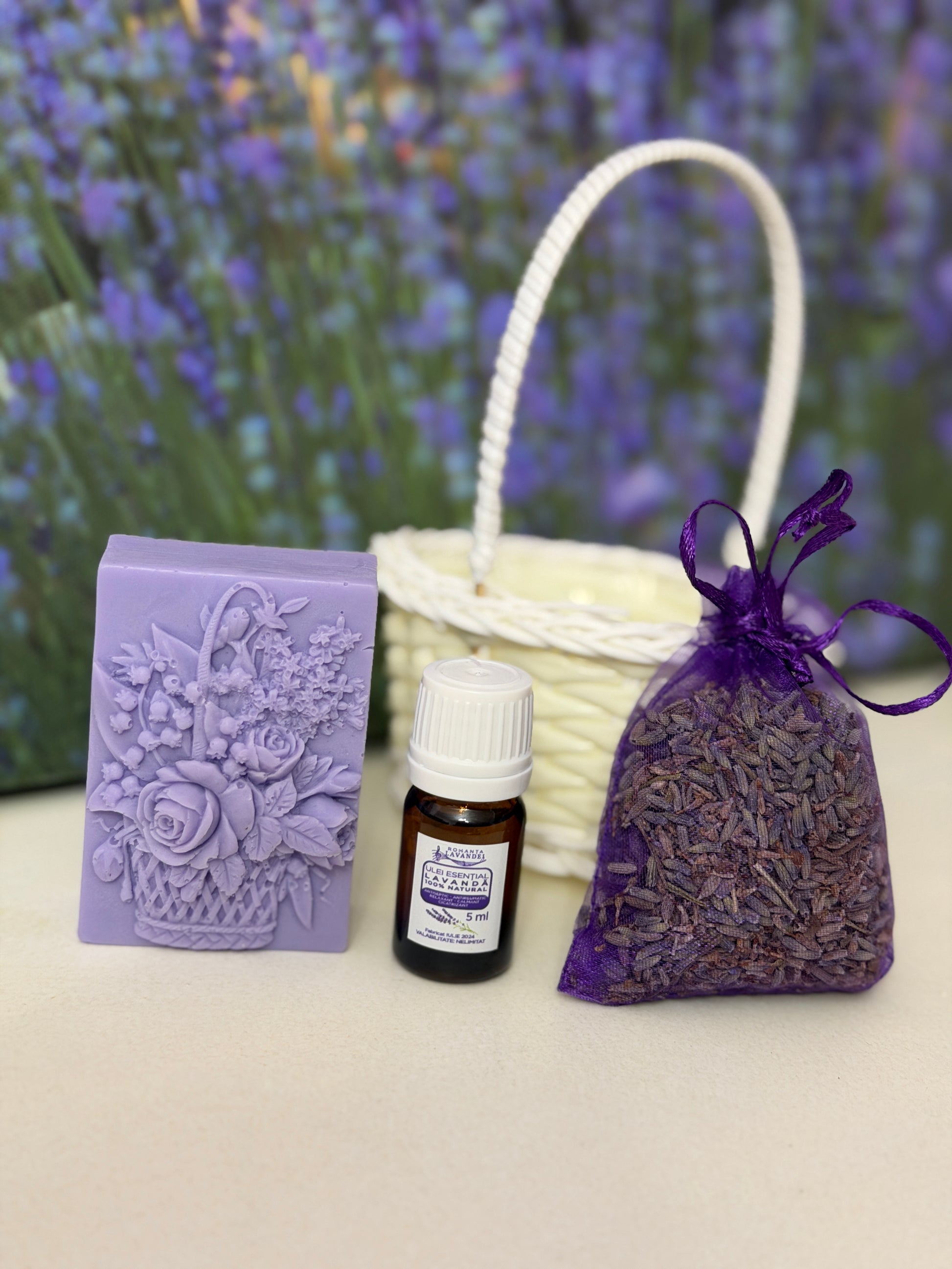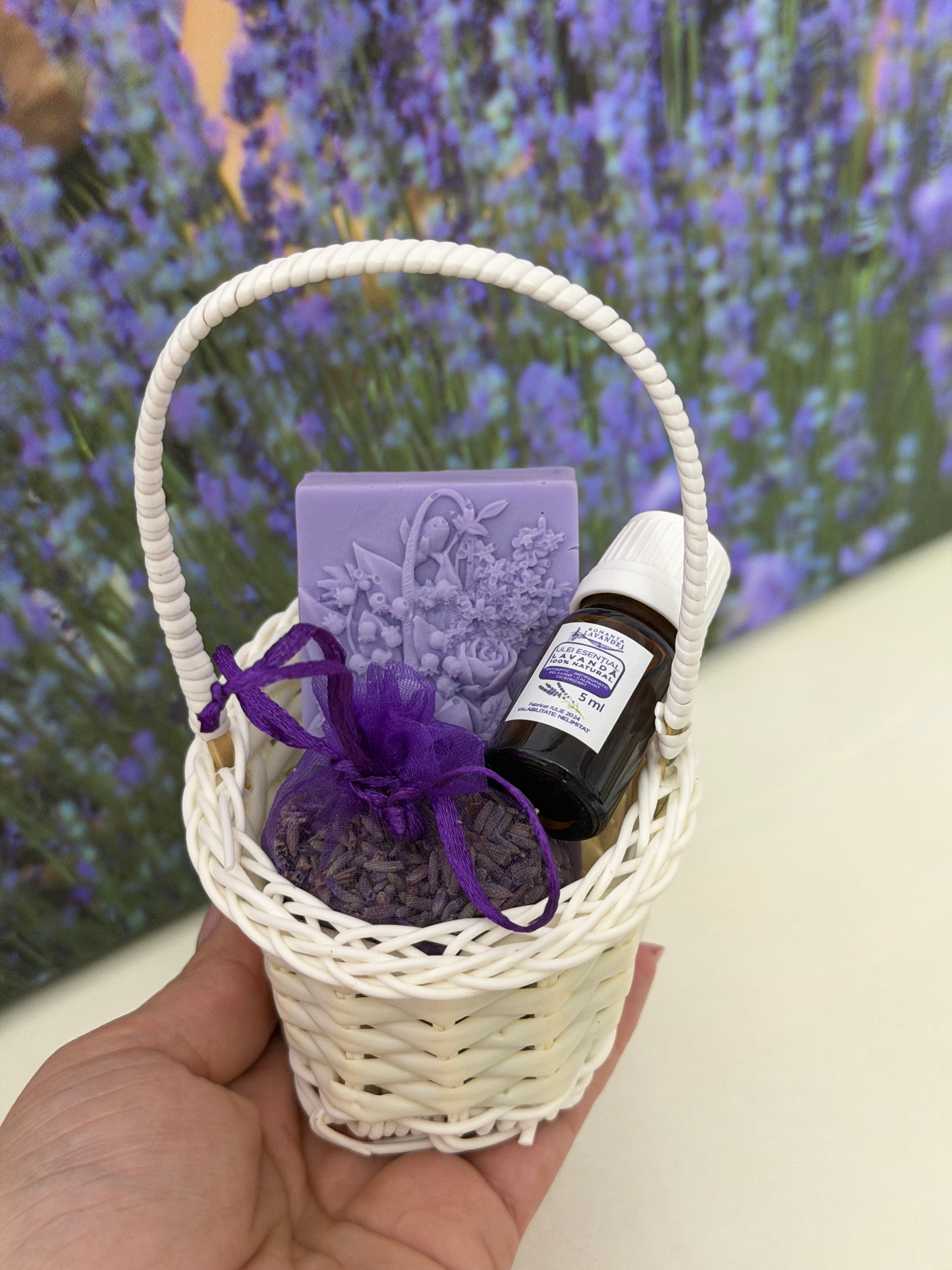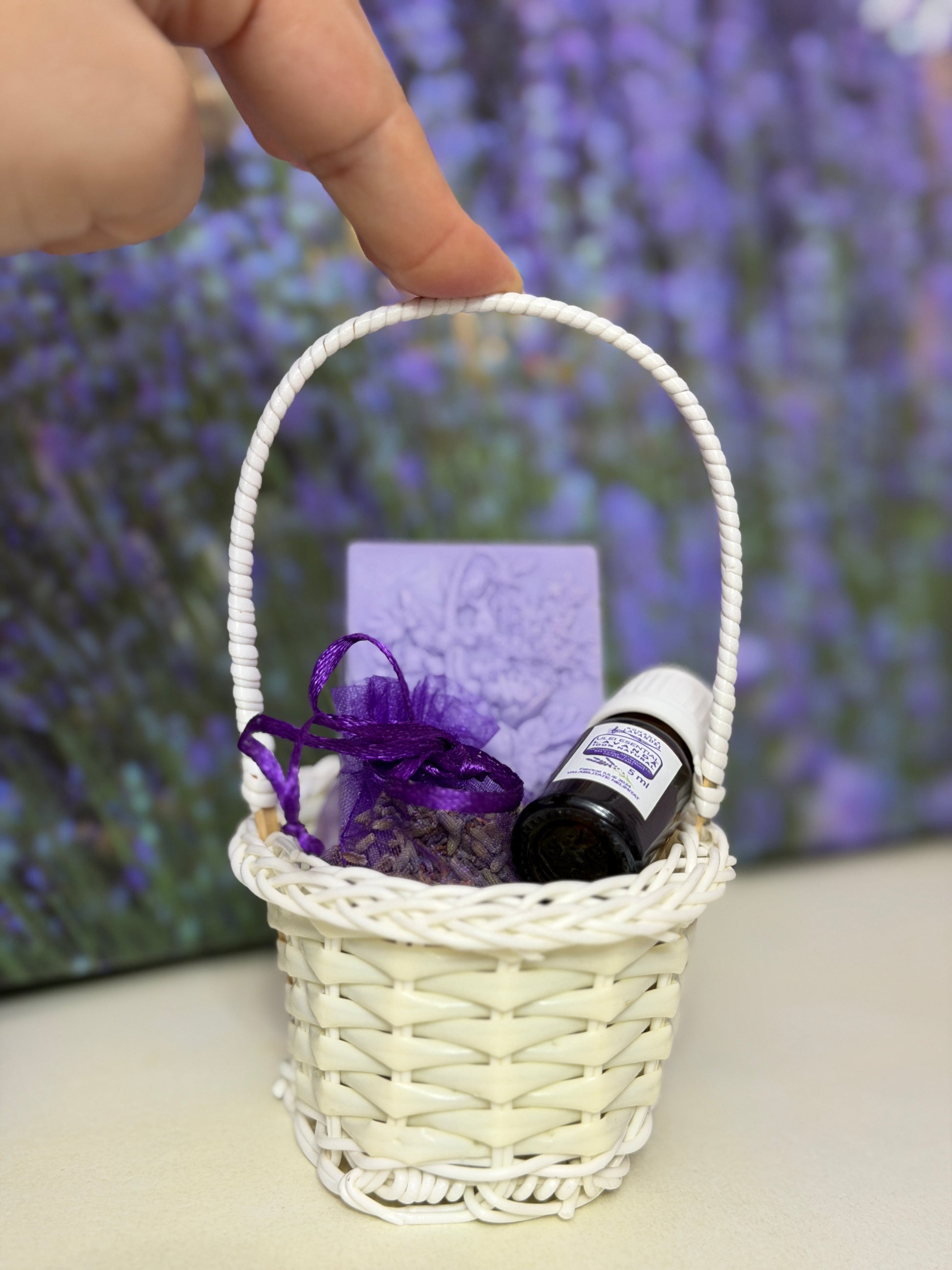 Un cadou delicat, care aduce parfumul primăverii într-un coșuleț elegant. Setul conține un săpun cu flori, un săculeț cu lavandă și un ulei esențial 100% natural, toate realizate cu grijă în atelierul nostru.